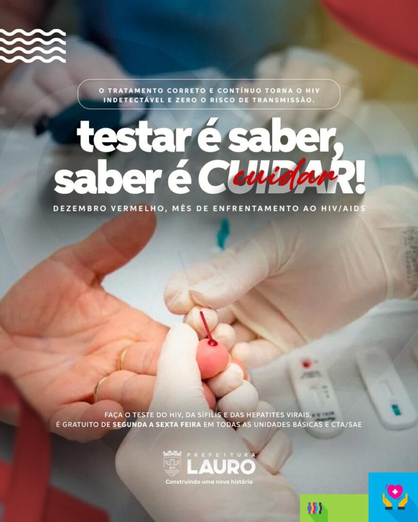 A Prefeitura de Lauro de Freitas, por meio da Secretaria Municipal de Saúde (SESA), dará início nesta segunda-feira (8/12) à programação do Dezembro Vermelho, campanha nacional de enfrentamento ao HIV/AIDS e outras Infecções Sexualmente Transmissíveis (ISTs). As ações reforçam a importância da prevenção, assistência, proteção, promoção da saúde, diagnóstico precoce e tratamento, garantindo cuidado integral à população.