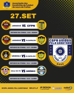 No sábado (27/9), a partir das 9h, a Copa Unidos pela Garotada de Futebol terá mais uma etapa decisiva no Estádio Municipal Edvaldo Costa Santos, conhecido como Estádio de Itinga. Às 14h, a competição segue para o bairro de Portão, com disputas no Campo da Rua Haroldo Silva, na localidade da Boca da Mata.