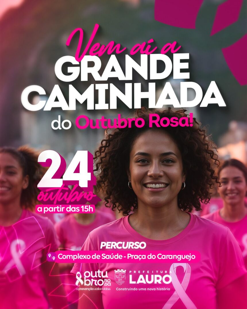 A Prefeitura de Lauro de Freitas, por meio da Secretaria Municipal de Saúde (SESA), convoca a população para um ato de conscientização sobre a importância do autocuidado. A Caminhada do Outubro Rosa vai ocupar as ruas da cidade a partir das 15h da próxima sexta-feira (24/10), com concentração no Complexo de Saúde e destino final na Praça do Caranguejo, em Itinga.