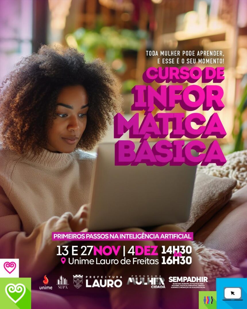A Prefeitura de Lauro de Freitas, por meio da Secretaria Municipal da Mulher, Políticas Afirmativas, Direitos Humanos e Promoção da Igualdade Racial (SEMPADHIR) e do Programa Mulher Cidadã, realizará, nos dias 13 e 27 de novembro e 4 de dezembro, o curso “Informática Básica – Primeiros Passos na Inteligência Artificial”, totalmente gratuito.