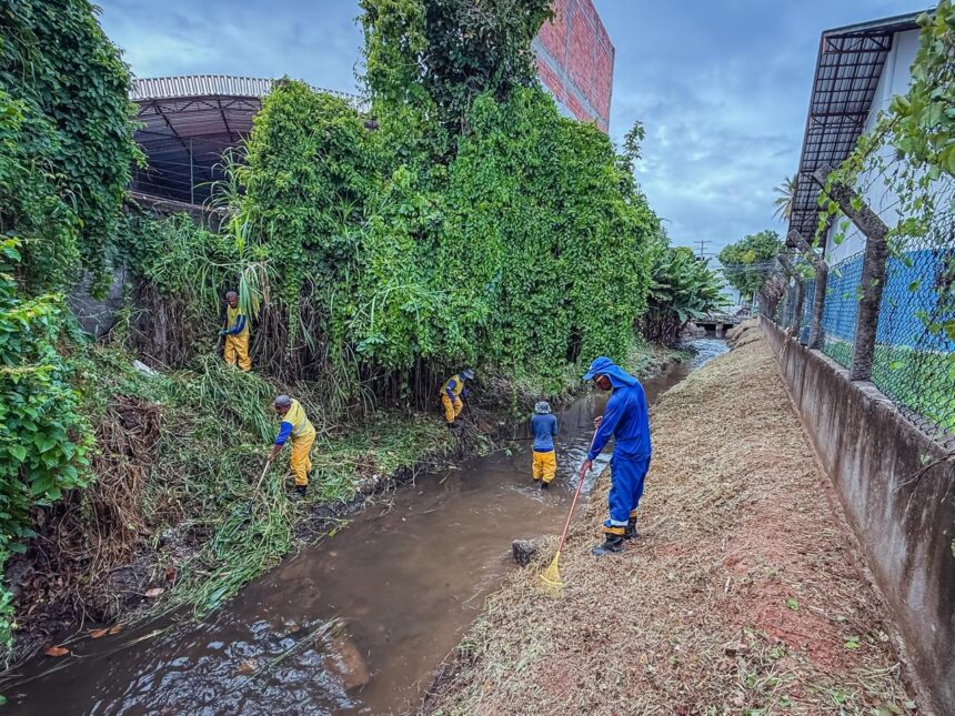 Os serviços estão sendo realizados de forma manual e mecanizada, com o uso de roçadeiras para a remoção da vegetação nas margens do canal, além da retirada de resíduos descartados irregularmente no local. A presença de lixo e entulho é um dos principais fatores que comprometem o fluxo da água e potencializam os riscos de alagamentos.
