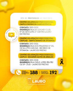 A Prefeitura de Lauro de Freitas, por meio da Secretaria Municipal de Saúde (SESA), iniciou as ações do Setembro Amarelo, mês de prevenção ao suicídio e valorização da vida, com atividades que seguem até o fim do mês em todas as unidades de saúde do município. A campanha, de alcance nacional, tem como foco principal estimular hábitos de promoção da saúde, o cuidado e o bem-estar emocional e, sobretudo, o fortalecimento dos vínculos comunitários.