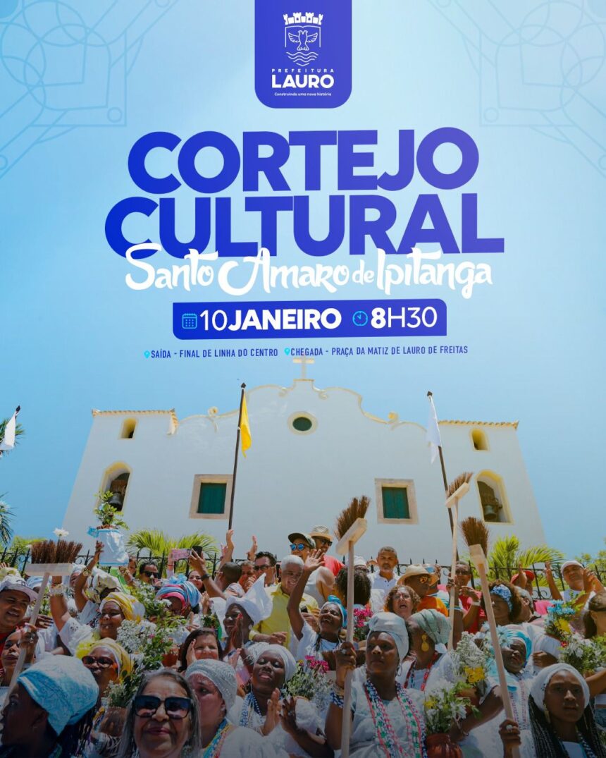 Com muita fé, tradição e manifestações culturais, a Prefeitura de Lauro de Freitas, por meio da Secretaria Municipal de Cultura, Lazer, Juventude e Esporte (SECULJE), realiza neste sábado (10/1) o tradicional Cortejo Cultural em homenagem a Santo Amaro de Ipitanga, padroeiro do município.