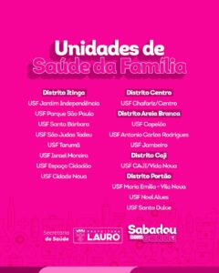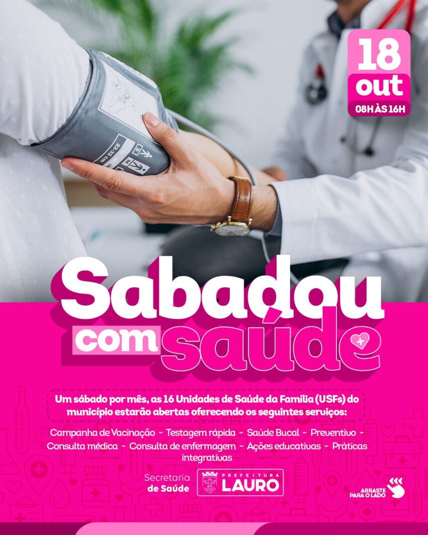 Com foco no cuidado da saúde da população, e na garantia de acesso aos serviços da Atenção Básica do município. A Prefeitura de Lauro de Freitas, por meio da Secretaria Municipal de Saúde (SESA), realiza neste sábado (18/10), a segunda edição do projeto “Sabadou com Saúde”. A ação vai acontecer nas 16 Unidades de Saúde da Família (USFs) do município.
