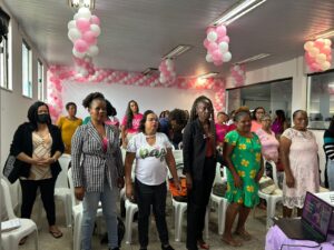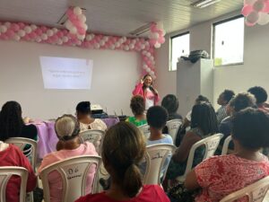 Com intuito de promover a conscientização sobre o câncer de mama, a Prefeitura de Lauro de Freitas, por meio da Secretaria Municipal de Desenvolvimento Social e Cidadania (SEMDESC), promoveu nesta quinta-feira (23/10), uma ação com orientações sobre cuidados de saúde e prevenção da doença para um grupo de mulheres do Centro de Referência de Assistência Social (CRAS) de Itinga II. A ação aconteceu no Restaurante Popular, localizado na Rua Euvaldo Santos Leite, Centro, e contou também com a presença de frequentadores do equipamento.