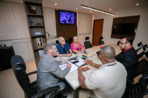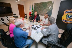 O encontro reuniu o secretário da pasta, Glauber Moraes e representantes da Associação Sociedade Amigos do Loteamento Vilas do Atlântico (SALVA) e o grupo SBS, especialista em soluções integradas de segurança, com o objetivo de definir as estratégias para a implantação do sistema, que será instalado inicialmente no bairro de Vilas do Atlântico.